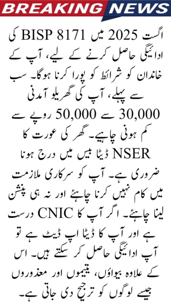 To receive the BISP 8171 payment in August 2025, your family must meet the conditions. First, your household income should be less than Rs 30,000 to Rs 50,000. The woman of the house must be listed in the NSER database. You should not work in a government job or receive a pension. If your CNIC is valid and your data is updated, you can get the payment. Also, people like widows, orphans, and those with disabilities are given priority.