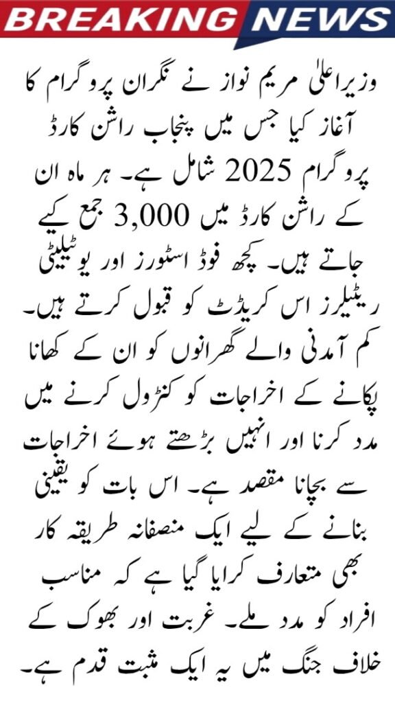Chief Minister Maryam Nawaz launched the Nighaban Program, which includes the Punjab Ration Card Program 2025. Eligible families will have Rs. 3,000 credited to their ration card each month. Certain food stores and utility retailers accept this credit. Helping low-income households control their cooking expenses and shield them from growing costs is the aim. A fair procedure is also introduced to ensure that the appropriate individuals receive assistance. This is a positive step in the fight against poverty and hunger.