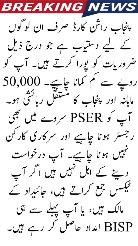 The Punjab Ration Card is only available to people who fulfill the following requirements. You must earn less than Rs. 50,000 per month and be a permanent resident of Punjab. You must also be registered in the PSER survey and not be a government worker. You are not eligible to apply if you submit taxes, own property, or are already receiving BISP assistance.
